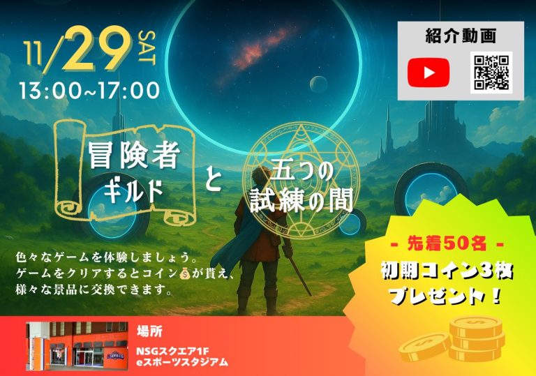 こんにちは。 eスポーツ科の佐々木です🎮 11/29(土)にeスポーツ科の学生たちが「イベント運営実習」という授業内で企画したオリジナルイベントが行われました! 「冒険者ギルドと五つの試練の間 … 続きを読む 【eスポーツ科】学生たちが企画したゲームイベントが行われました!!