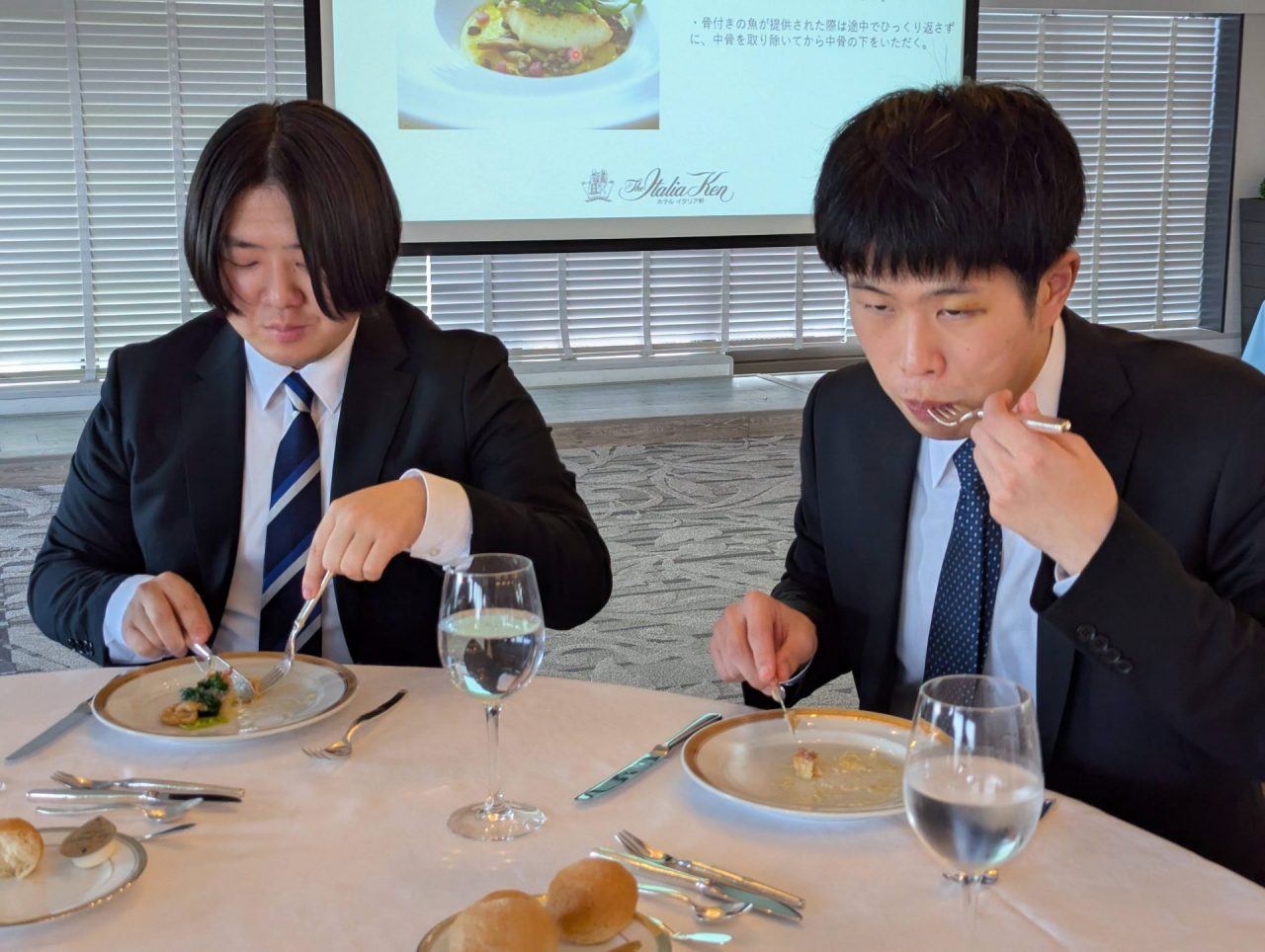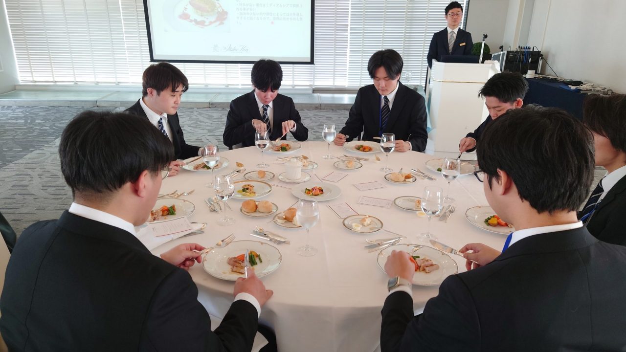 コース料理を実際に食べながら、社会で必要となるテーブルマナーについて実践的に学ぶという内容です。