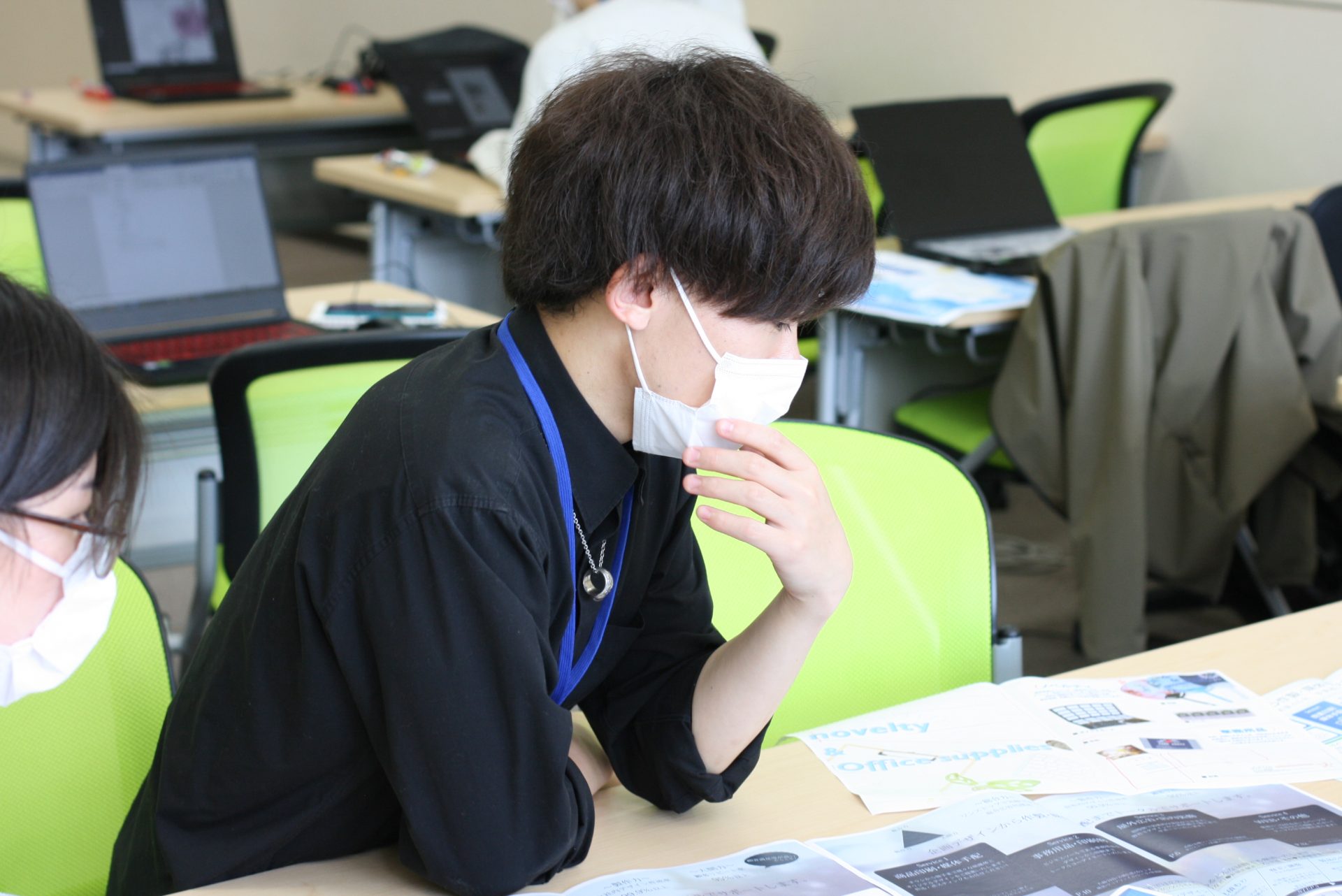 先日行われた作品発表会に向けて、作品を印刷しパネルにしている1年生▼